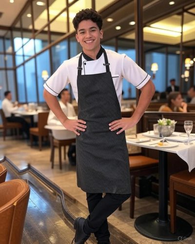 - در رستورانهای ایتالیایی: تیشرتهای یقهدار یا پیراهن سفید کلاسیک با پیشبند قرمز